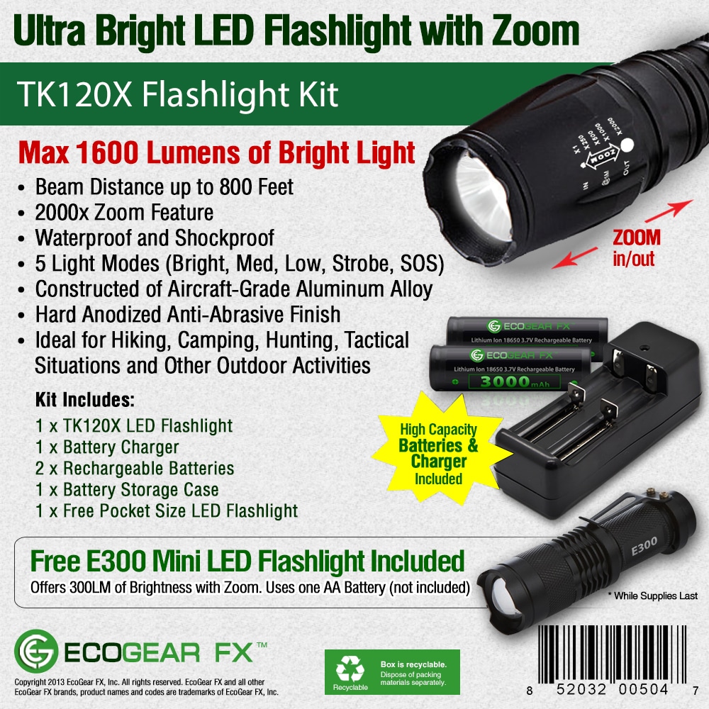 The TK120X LED Flashlight offers so many exciting features and, for a limited time, it comes with a free holster. Add the TK120X LED Flashlight Kit to your shopping cart and the FREE holster is automatically included. These are a Special Buy so once they run out; you may not be able to find them again with the holster. And, a holster is so handy if you’re out working on a job site or hunting in the dark.