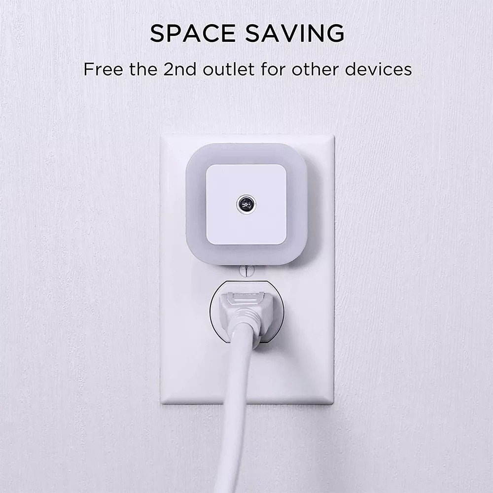 • COMPACT & LIGHT WEIGHT: Offers a modern square design that is small for easy placement in any location in your home. This smart bright night light plugs into in any outlet and allows the second outlet free for other devices.